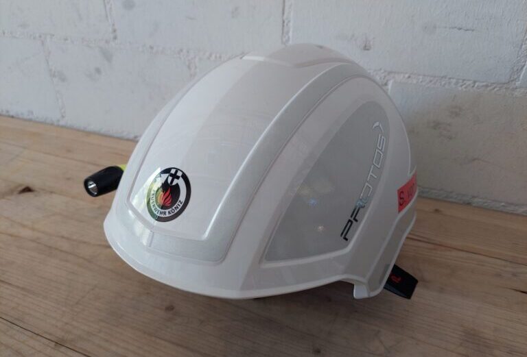 Glasfaser- und Aramid-verstärkter Komposit-Helm mit grossem transparentem Gesichtsschutzvisier, separat zuklappbarer Augenschutzbrille, oben angebrachter LED-Leuchte und kurzem Nackenschutz aus feuerbeständigem Aramidgewebe (Nomex). Jeder Helm ist zusätzlich mit einer funk-Sprechgarnitur ausgerüstet.